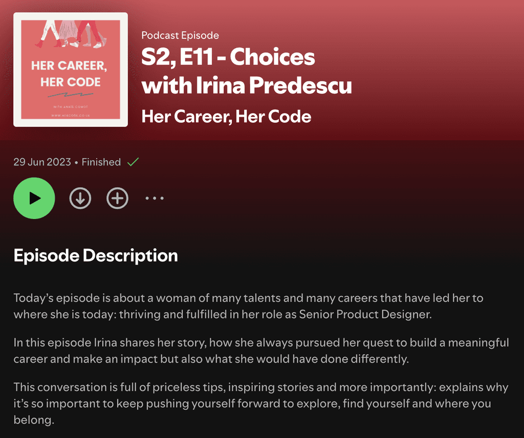 I was honoured to be interviewed by Anaïs Comot for her podcast "Her Career, Her Code" back in 2023.