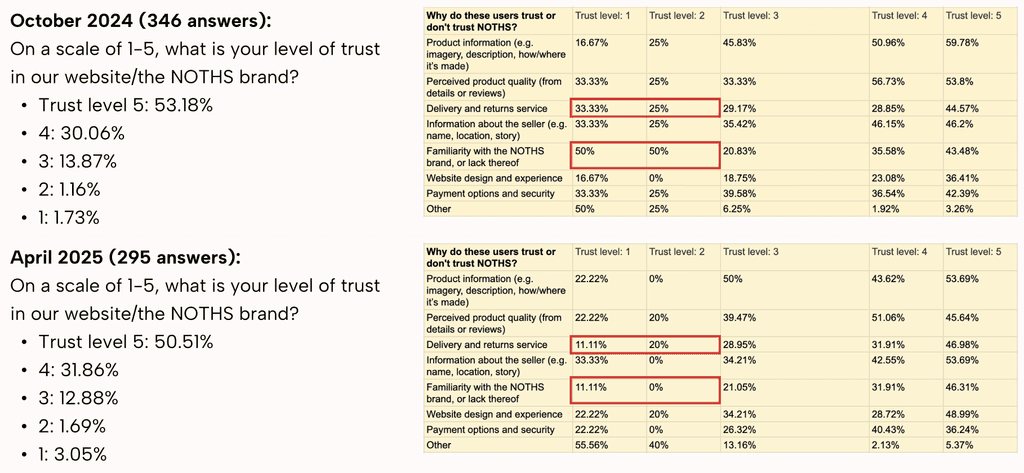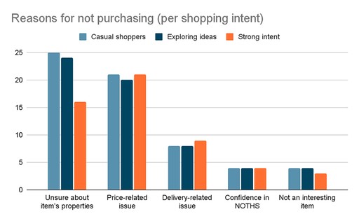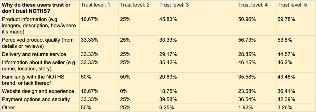 Understanding user behaviour: surveyed paid marketing users visiting PDPs to better understand their shopping intent, reasons for exiting and not purchasing items, and their level of trust in NOTHS as a brand.