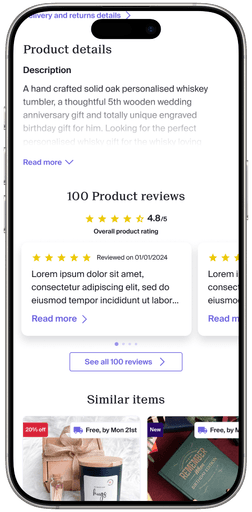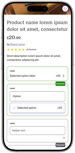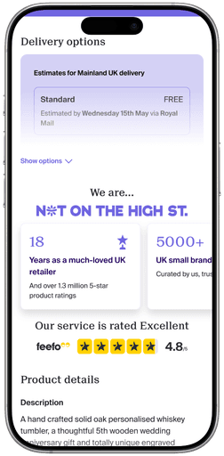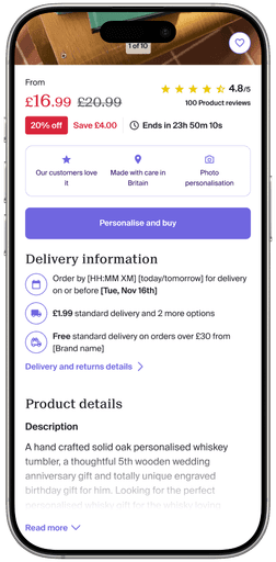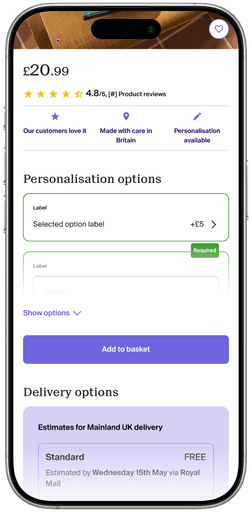 Updated legacy (cont.): Cleaned up layout, placed personalisation options behind a tap, redesigned delivery information.